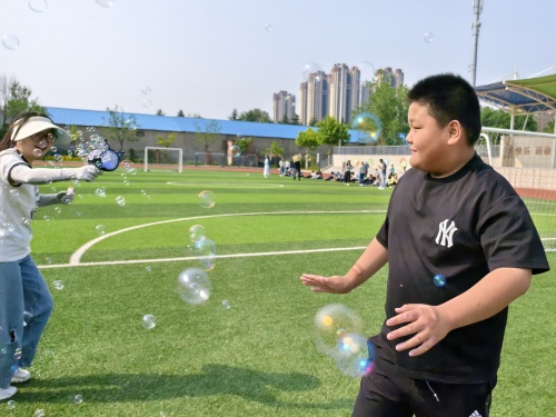 孩子們興奮地穿梭其中,有的伸出小手努力去觸摸泡泡,有的歡快地奔跑著,笑聲在操場(chǎng)上回蕩。老師們也參與其中,用泡泡機(jī)吹出更多的泡泡,與孩子們一同享受這歡樂(lè)的時(shí)刻。